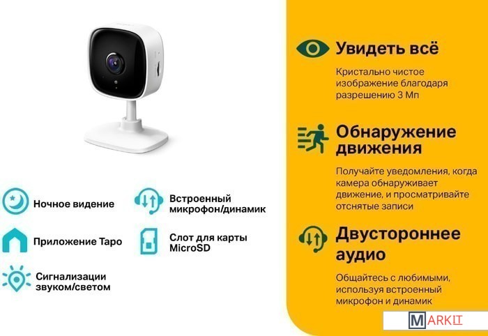 Получайте уведомления, когда камера обнаруживает движение, и просматривайте отснятые записи. Вы также можете персонализировать настройки, указав важные зоны обнаружения движения, чтобы всё происходящее фиксировалось только в выбранной зоне.Не будите детей, заходя к ним в комнату. Присматривайте за ними с телефона благодаря ночному видению на расстоянии до 9 метров — и вам спокойно, и дети поспят.Видео в высоком разрешении 3 МП позволит получить чёткое изображение. Это улучшит распознавание лиц на расстоянии.Общайтесь с любимыми, используя встроенный микрофон и динамик.Ваша приватность гарантируется соответствующим режимом и картой памяти.Камера не только уведомит вас об обнаруженном движении, но и включит световую и звуковую сигнализацию.С бесплатным приложением Tapo всё необходимое всегда под рукой.